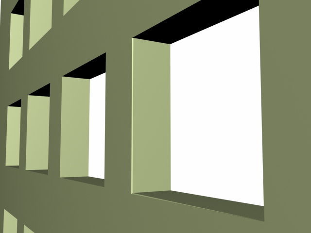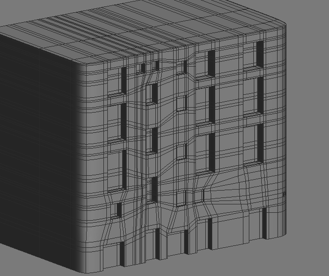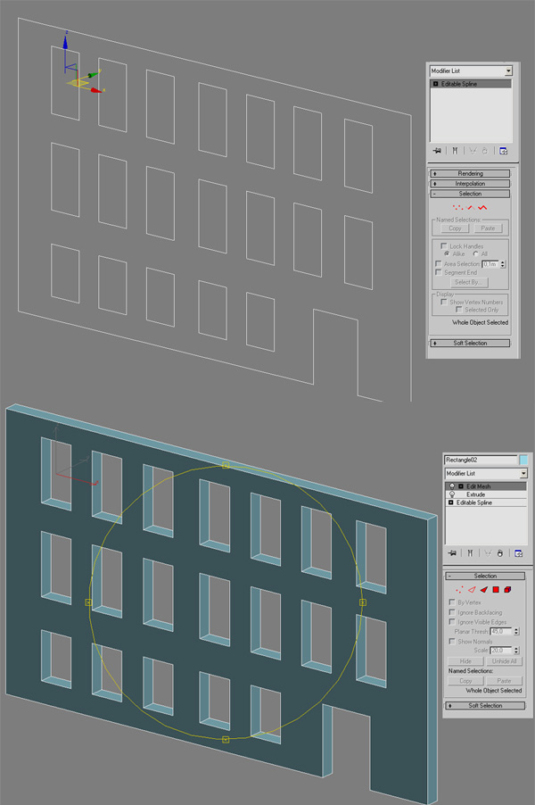 El muro, por ejemplo, se humilde en Spline editable, se ata a cada una de las ventanas y se aplica un modificador extruir con un valor de 15. Total menos de 10 sg y la malla no puede ser más limpia y sencilla.