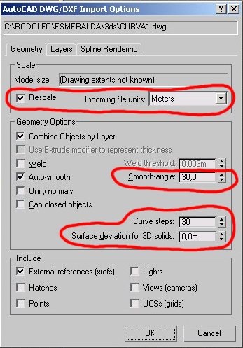 Lo que es importante de todas maneras al importar es determinar el número de paso de curva que sale en el cuadro importar de max, allí uno determina, al igual que en AutoCAD, el no, de caras por curva, esto es lo primero que se debe hacer, por otra parte si no funciona, entonces te figuro el paso 2.