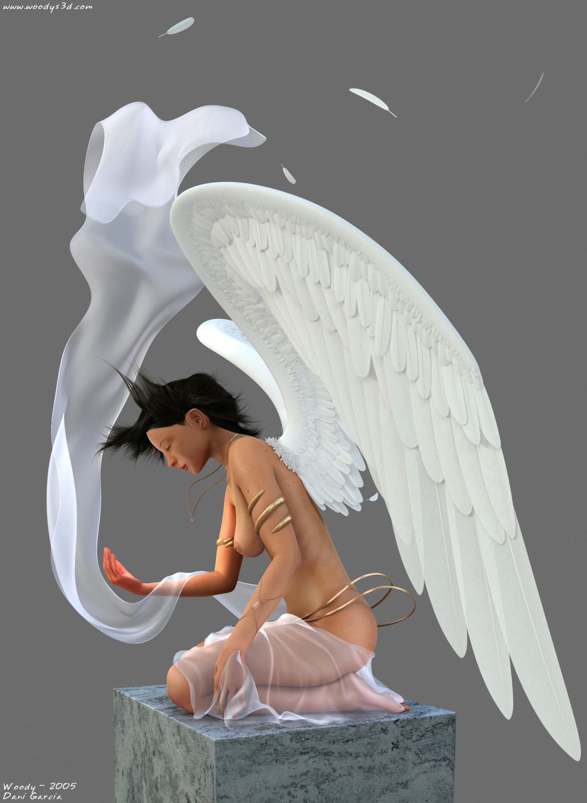 Bueno, aquí tenéis los cambios. Sobre todo, he tocado la cámara, la tela y la forma de las alas. Intente arreglar un poco la unión cuerpo-ala, pero no me gustó lo que probé, los músculos no le pegaban, total, que me esperare a texturizar para ver cómo queda y si acaso le añadiré alguna capa de plumas finas.