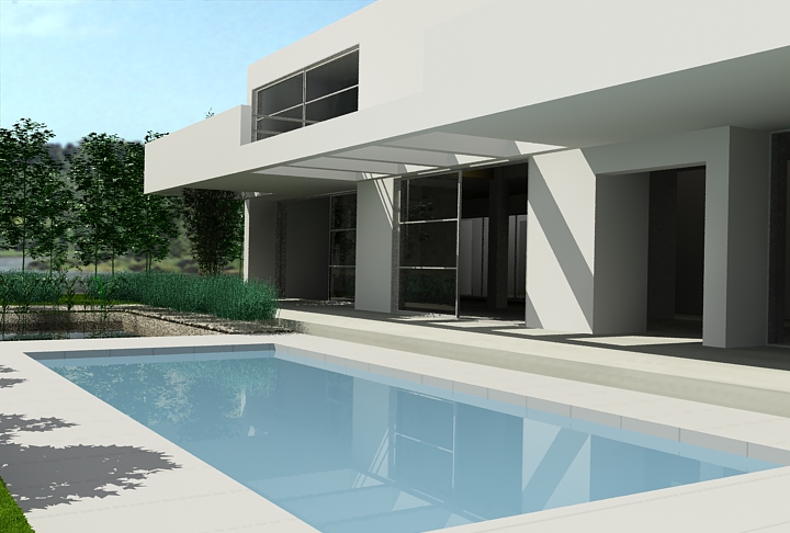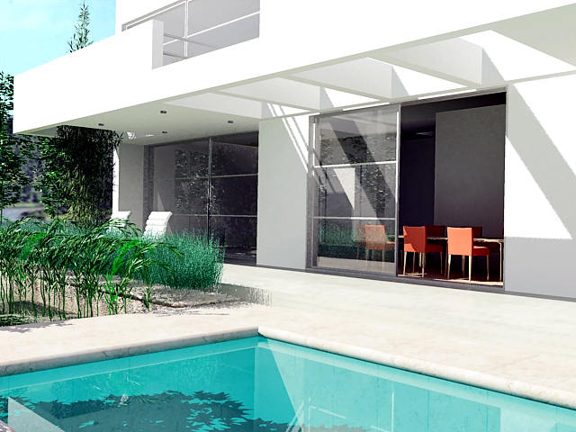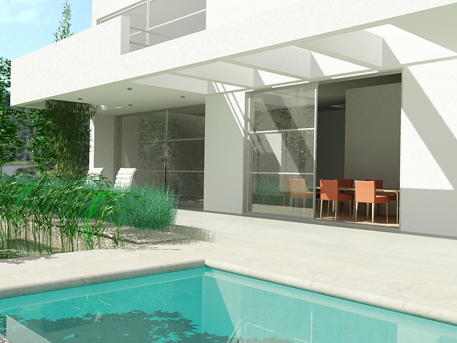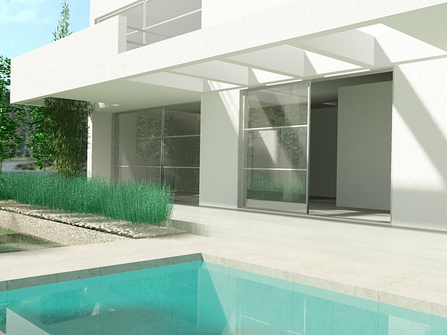 Lo del agua de la piscina es menor, pero a la piscina le falta su borde. Tenes un grave problemas con los vidrios, que se ven mal y te arruina bastante el render, busca en el foro sobre vidrios que hay mucho material sobre el tema.