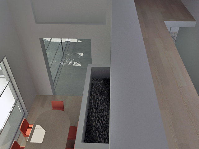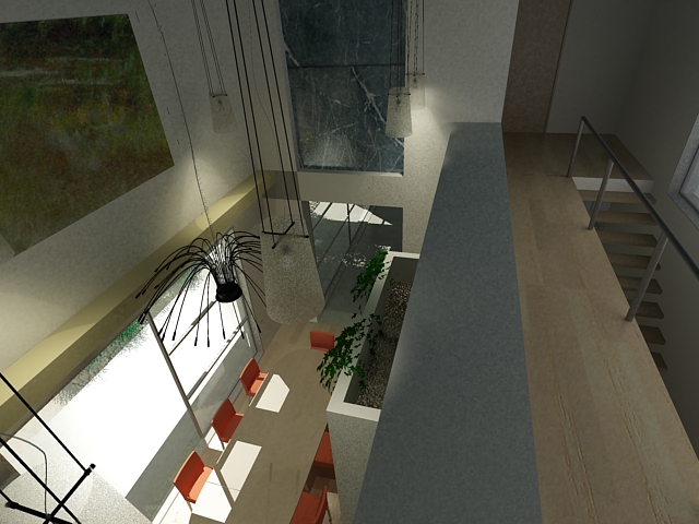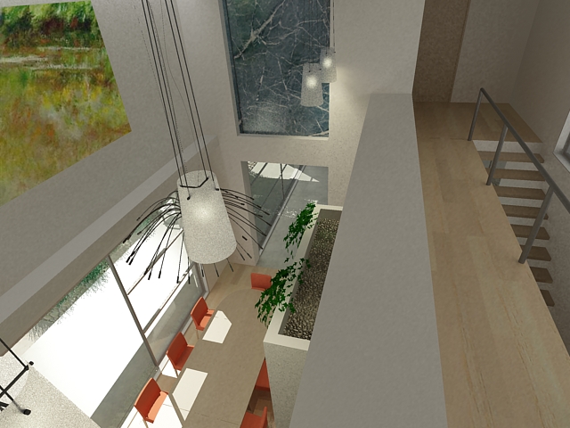 Hola, bueno todavía no se ve mucho del interior, quizás deberías abrir para que se viera más interior por que sólo se verá el paso y la llegada de la escalera, puedes subir un poco la cámara, tampoco estaría de más pensar qué tipo de luz colocaras en la mesa.