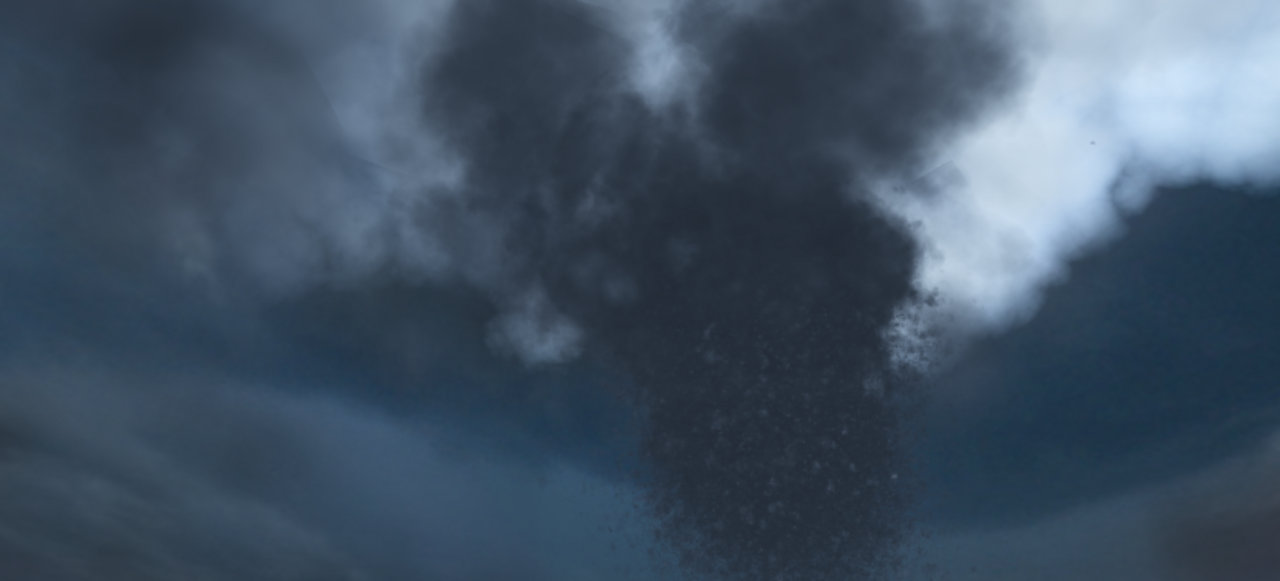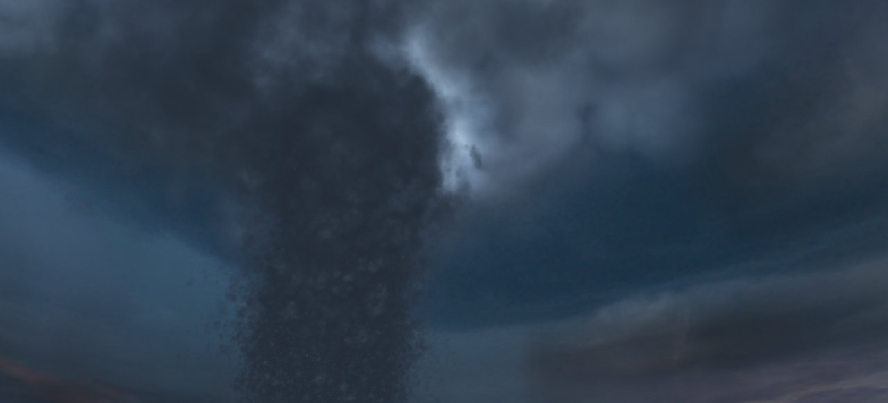 También mete más tipos de partículas, con diferentes Shaders para darle al tornado todo el detalle que se merece, ya sabes, spray de agua, granizo, gotas, polvo, las nubes igual también las movería un poco más, bueno, como dicen por ahí, mis dos centavos, un saludo.