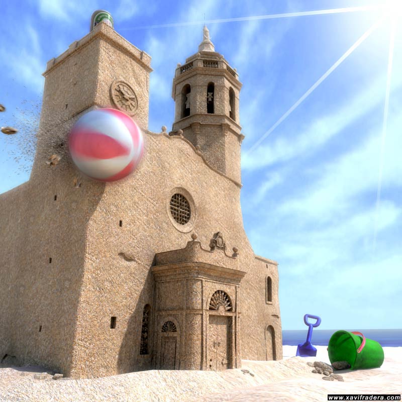 Este es un trabajo que realicé hace ya unos días. En un principio quería modelar la iglesia de mi pueblo, Sitges, tal y como es. Pero mientras avanzaba en el modelado se me ocurrió esculpirla en arena. Es una tradición encontrar escultores de arena en las playas de Sitges, así que, me pareció una idea excelente.