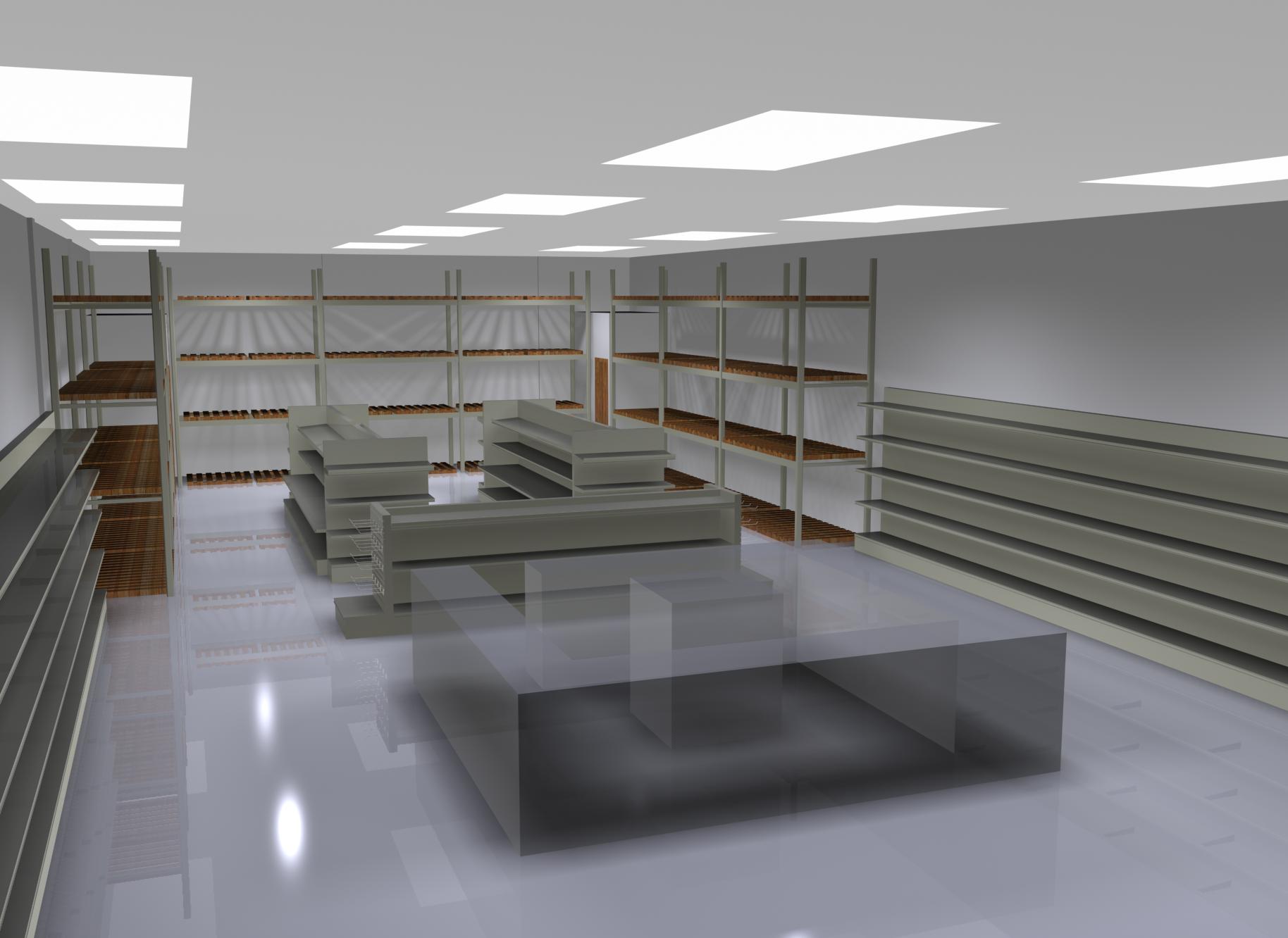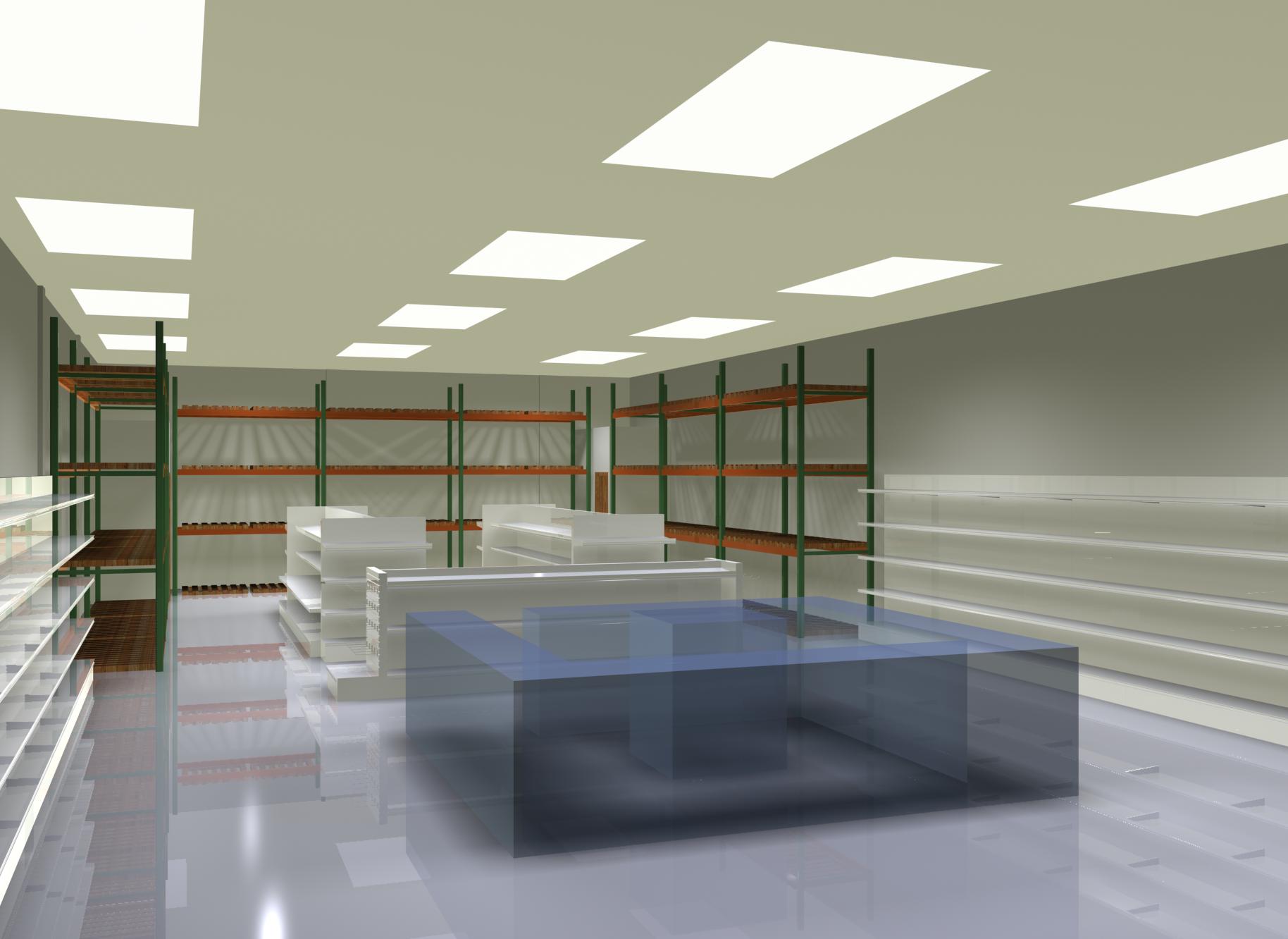 Hola, fíjate he mejorado un poco las luces del techo, no puedo ponerle una luz principal o alguna ventana porque literalmente no existe, esa tienda está dentro de un centro comercial y no tiene ventanas y no le llega de ninguna forma la luz solar, pero retoque un poco el piso y las luces además de los colores y el nombre en las paredes, saguire mejorando y publicaldo los avances, con respecto al modulo central voy a empezar a modelar y luego publico otra imagen con el mueble saludos.