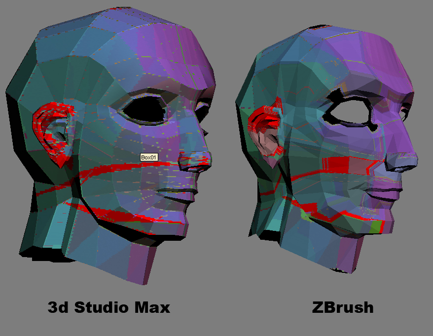 Luego, al exportar de ZBrush a max, la malla se queda con las coordenadas que crea ZBrush, parecidas, pero ni de coña las mismas, con lo que todo el trabajo previo en 3dsmax de ajustar las coordenadas se va al garete.