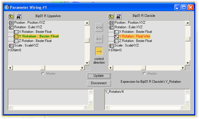 Pues era realmente sencillo, aunque parezca un Biped de Character Studio es un Cat. Lo que he hecho ha sido crear un nuevo layer y usar wire parameters tal y cómo está en la imagen adjunta. Y ya tengo una autoclavícula.