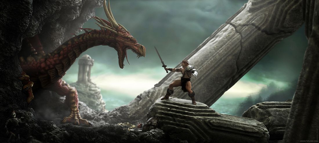 Muy bueno. Lo único es que yo habría puesto otro punto de vista. Habría puesto al guerreo en un primer plano con la cámara enfoncándolo desde detrás, dejando el dragón en el plano de fondo de forma que se note lo grande que es respecto al hombre, no sé si me entiendes. Es que una cámara así lateral me sabe a poco. Todo lo demás genial.