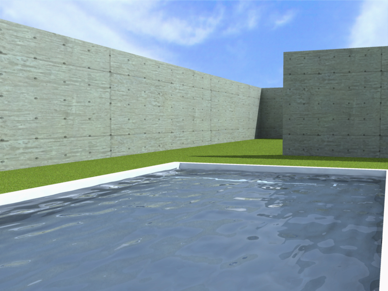 Además, quisiera saber cómo mejorar la calidad del césped(Vray displacement), para que se vea más real, y para que el muro pareciera más de hormigón a la vista (se ve muy plástico).
