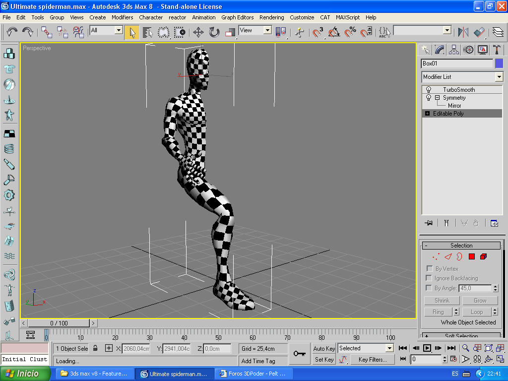 Pruebas pruebas. Aquí tenéis un screnchot. Pensar que está hecho en una hora y la postura en la que está hace que cueste un poco más en mapeado porque hay que definir más aristas para crear diferentes grupos de polígonos (que se hace en un por favor). Si estuviese en la posición del hombre de vitrubio lo podríais hacer hasta en media hora. Incluso menos.