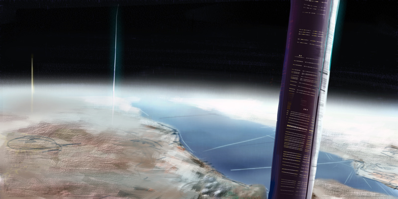 4. Las grandes torres : un concepto basado en el libro 3001:odisea final de Arthur c. Clarke. No sé si lo habéis leído. En un párrafo describe una escena en el cuarto milenio en la tierra en la que hay unas grandes torres que llegaban a la órbita geoestacionaria a 36000 km de altura. Painter y Adobe Photoshop 1 hora: gracias por echar un vistazo a estos bocetos.