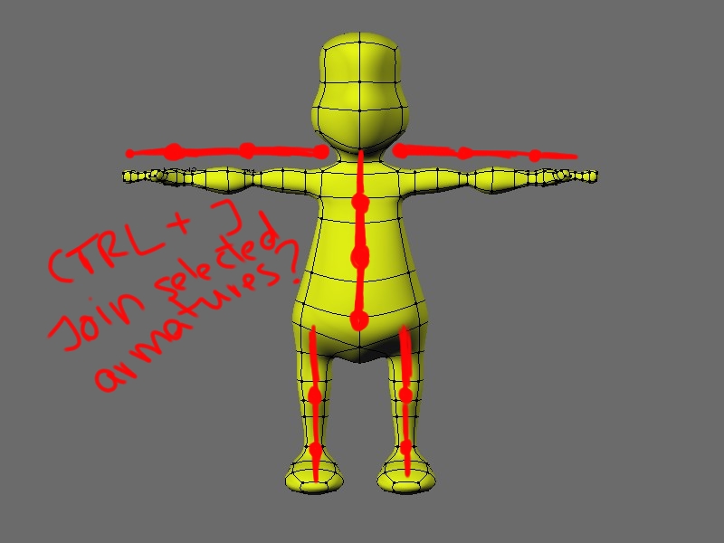 Buenas. Hoy he creado un personaje bastante sencillo, para empezar a animar. El que veis en imagen (echo a mano) será el Rig final, he riggeado muy poco, pero como lo ven? Tengo alguna duda, como, por ejemplo, si todos los huesos tienen que pertenecer a la misma familia, otra duda es la siguiente: si quiero hacer saltar al personaje, tengo que mover la malla sin tocar los huesos, ¿no? O hay alguna opción de hueso que te mueva, por ejemplo, al personaje completo? Gracias.
