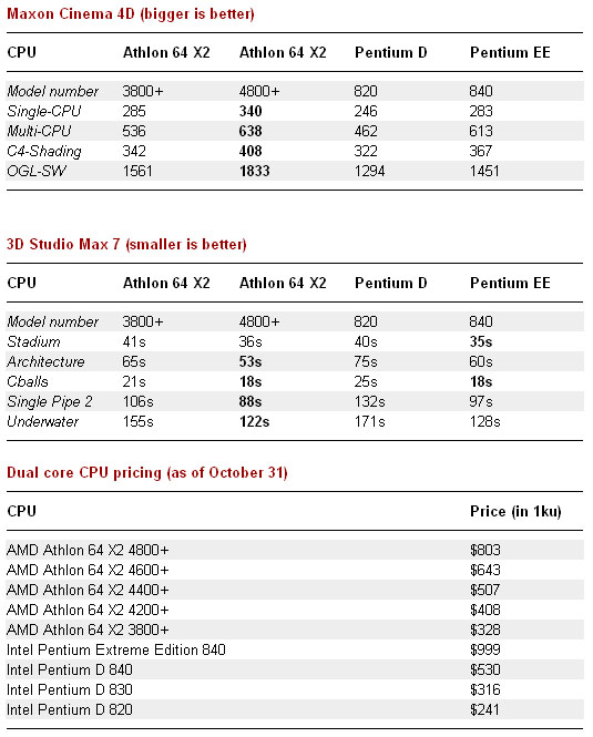 Por lo que se los Intel ganavan a los AMD en 3dsMax antes porque tenían HyperThreading, pero con los Pentium d que no llevan HT sale ganando el AMD 3800+.