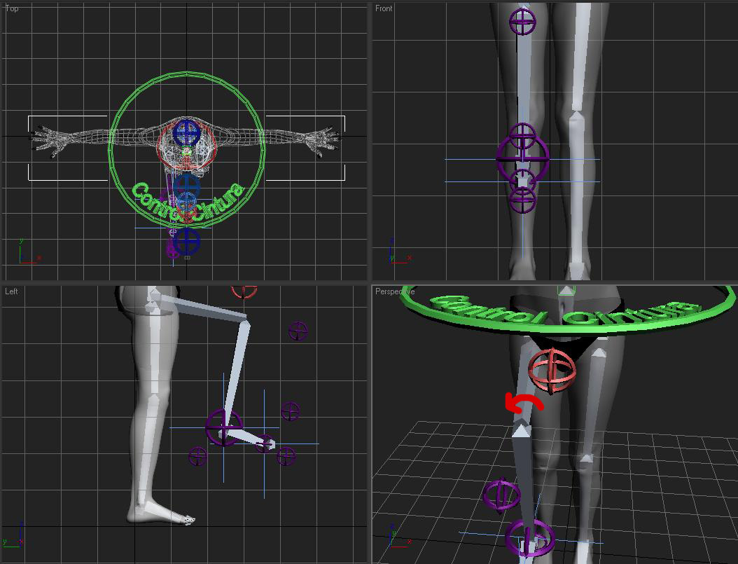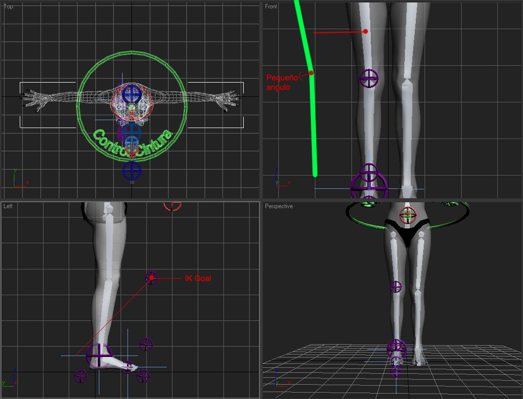 Es una pierna IK normal y corriente. A través de un sistema de un slider, es posible cambiar la posición de inicio y final de cada hueso, de manera que, cuando el slider esta al 100%, la pierna esta controlada por cuatro puntos: el inicio y el final de la pierna, y dos manipuladores, como si fueran las tangentes de una curva.