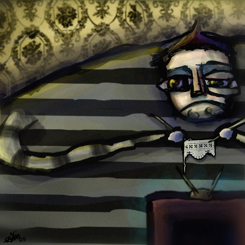 Me gusta tu estilo. La ilustración, al primer golpe de vista, el personaje me pareció pequeño, la cabeza, el tejido (el cuerpo) y las antenas del televisor (las patas) me parecieron el personaje. Después vi los brazos y el cuerpo enorme detrás.