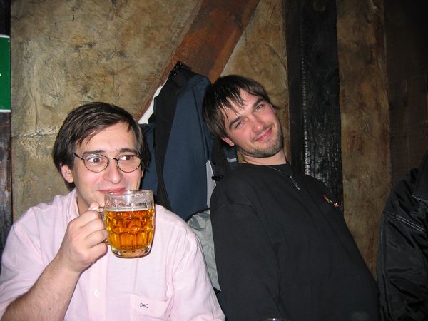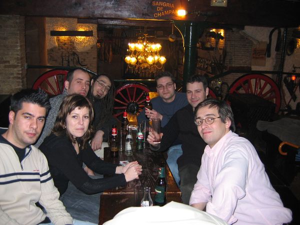 Pero entonces surgió la chispa, porque un grupo de mozas piden la inestimable ayuda de Carlos como fotógrafo. Tras acertar (a la tercera) con el botín de disparo en lugar del de on/of, logra sacar la fotografía. Y una de ellas pronuncia la frase mágica: es que es mi cumpleaños. evidentemente, comento la coincidencia. Ipso facto aparecen sendas copas de cava en nuestras manos (no hubo boicot). Charlamos con ellas, con el dueño del pub, con su compañera (Manoli, que gran mujer). Comentan su única estancia en Zaragoza, cuando el concierto de Metallica. Le comento que yo también fui y, hala, ronda de chupitos de j? Germeister de parte de la casa. Más chupitos, más cerveza, más cava, más rocknroll, con el cunit en whisky in the jar versión Metallica. Klópes bailando el Fraga dance. Vaya. Puf.