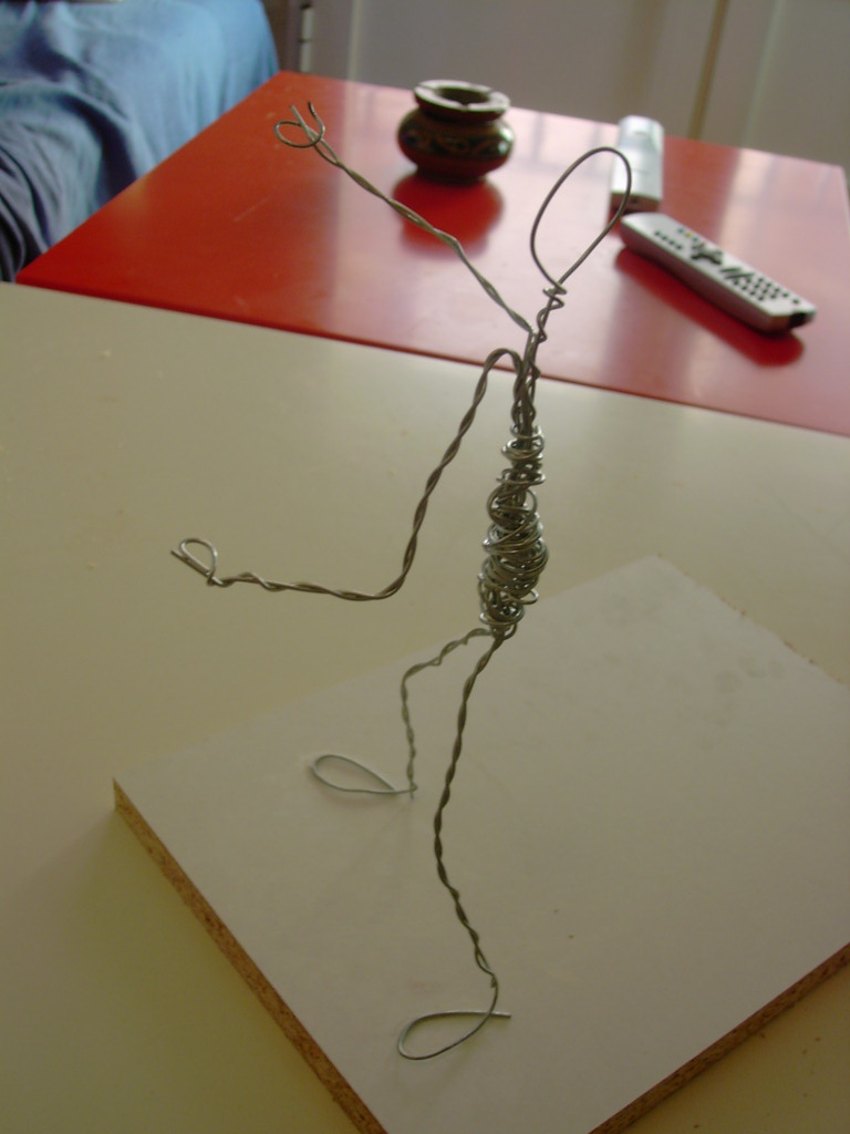 1 - Creé un esqueleto de alambre, dándole varias vueltas para que tuviese consistencia. Cuando más o menos me gustaba las proporciones, pequé los pies con super Glue a una tabla de madera.