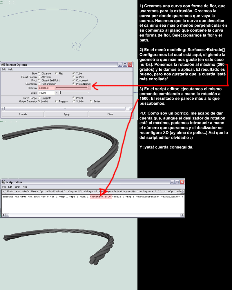 Pues he probado de muchas maneras, la primera fue haciendo el solevado recto y retorciéndolo con el comando torcer, pero sale una, quisiera saber si puedo, al asignar la forma, hacer que está vaya rotando los grados que yo quiera según se va solevando. Yo creía que está opción estaría disponivble, pero no la veo por ningún lado, he logrado hacer lo más parecido con helix y la forma estrellada y luego retorciendola, o sea tres pasos. Pero luego me toca doblar el cable a mano, por eso la opción de los solevados, para que siga el recorrido que he puesto. Pero no sé cómo hacer que la forma se vaya girando ella solita. Es decir, que yo elija el recorrido asigne la forma y le meta las vueltas que quiero que dé.