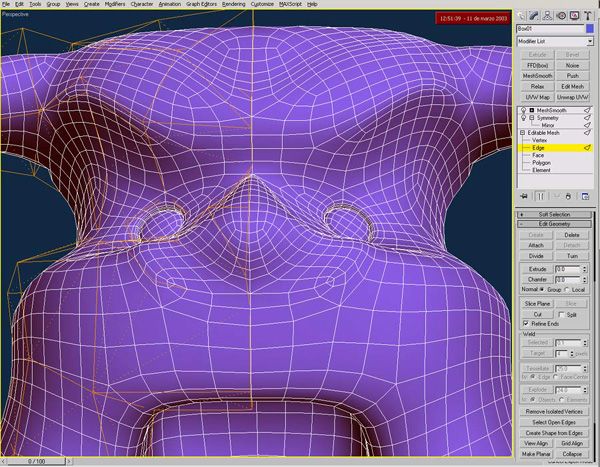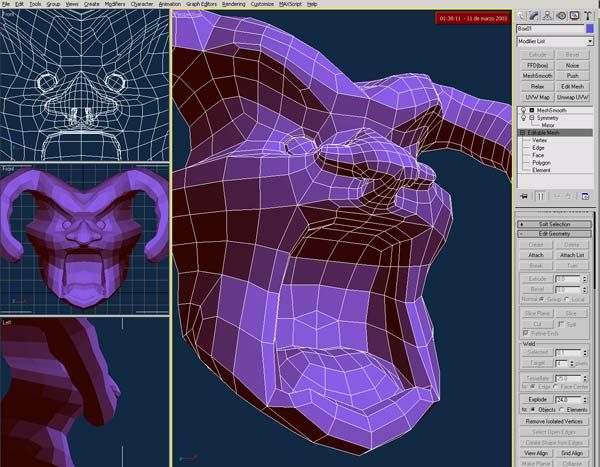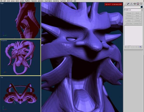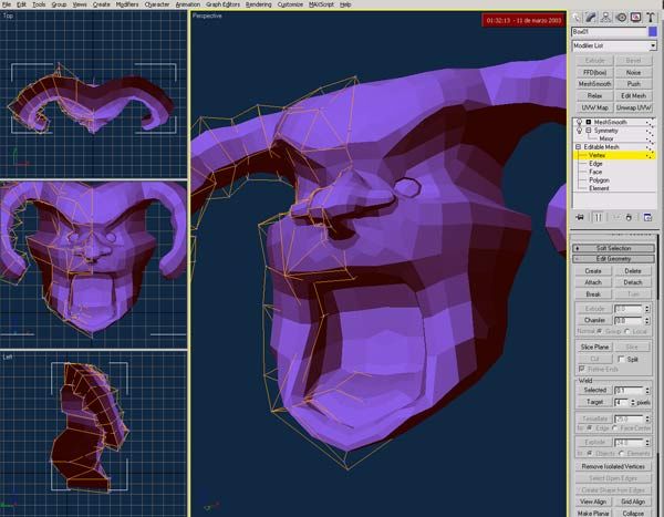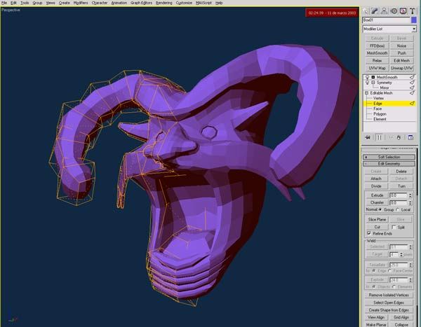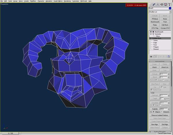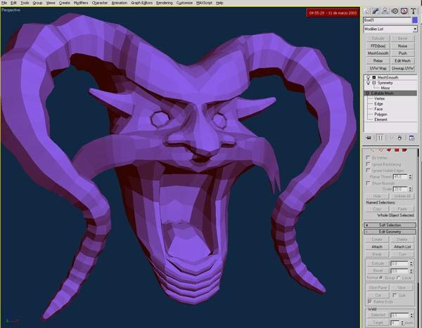 Buenas a todos. Esta es una máscara que acabo de empezar para una serie documental de TV sobre el carnaval de República Dominicana. Acabo de empezarlo, iré publicado el progreso, como tengo que hacer varias cosas al mismo tiempo no sé lo que voy a tardar, espero que poco porque tengo que hacer 6 o 7 del estilo, partiendo de una caja y utilizando Symmetry y Mesh Smooth, OF course. Se supone que son representación del diablo, y ya sabemos todos que no es famoso por ser muy guapo, así que, no me digáis luego Que feo. Saludos.