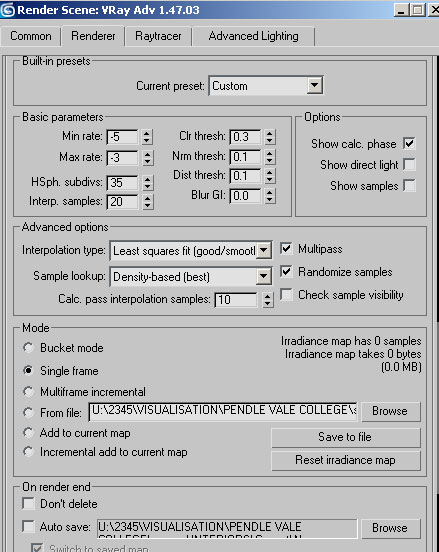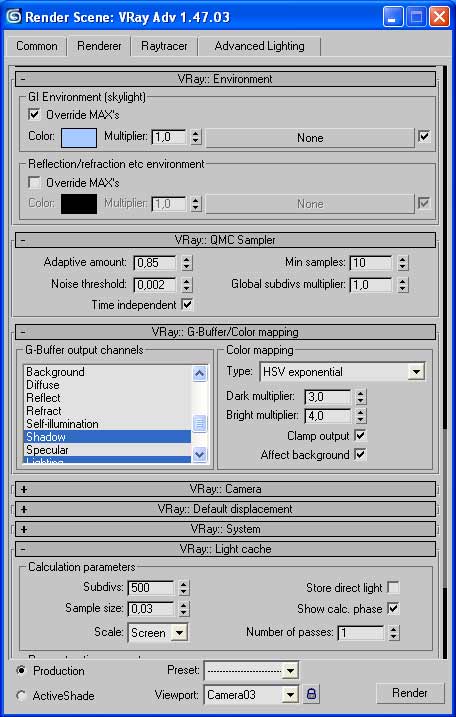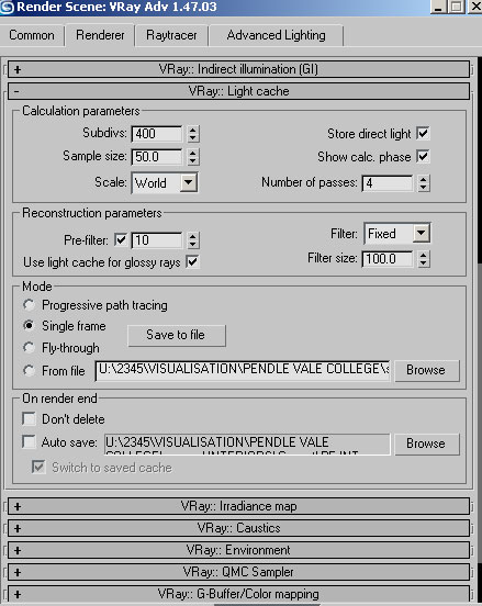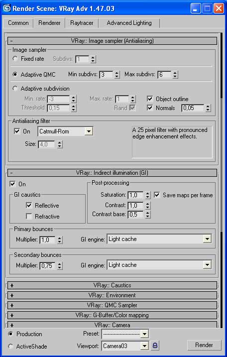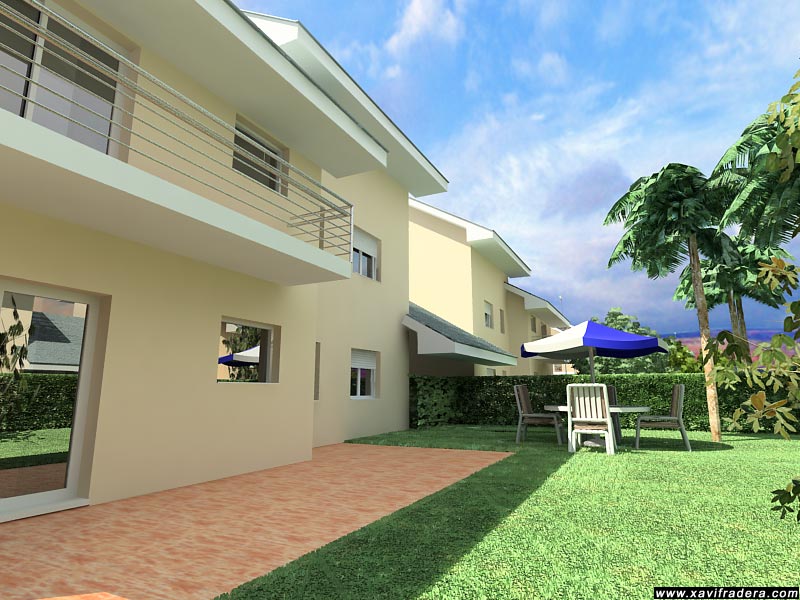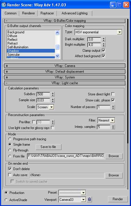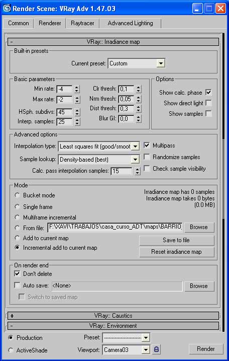 Mi ordenador es un Pentium 4 a 3 gigaherzios, tengo 1 Gb de Ram, uso 3ds Max 7 y Vray 1.47.03. La escena tiene más o menos 500.000 polígonos y los árboles son speedtre. El césped y los tejados son vrya displacement.