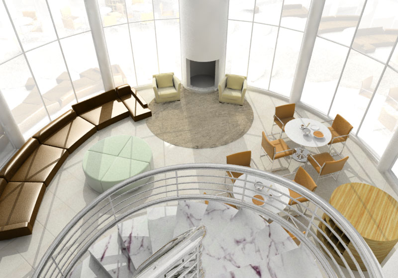 Buenísimo, la iluminación es muy destacable. Aunque no me convence la textura de madera de esa mesa redonda que parecen buzones abiertos (la que está al lado de las 2 mesas blancas).