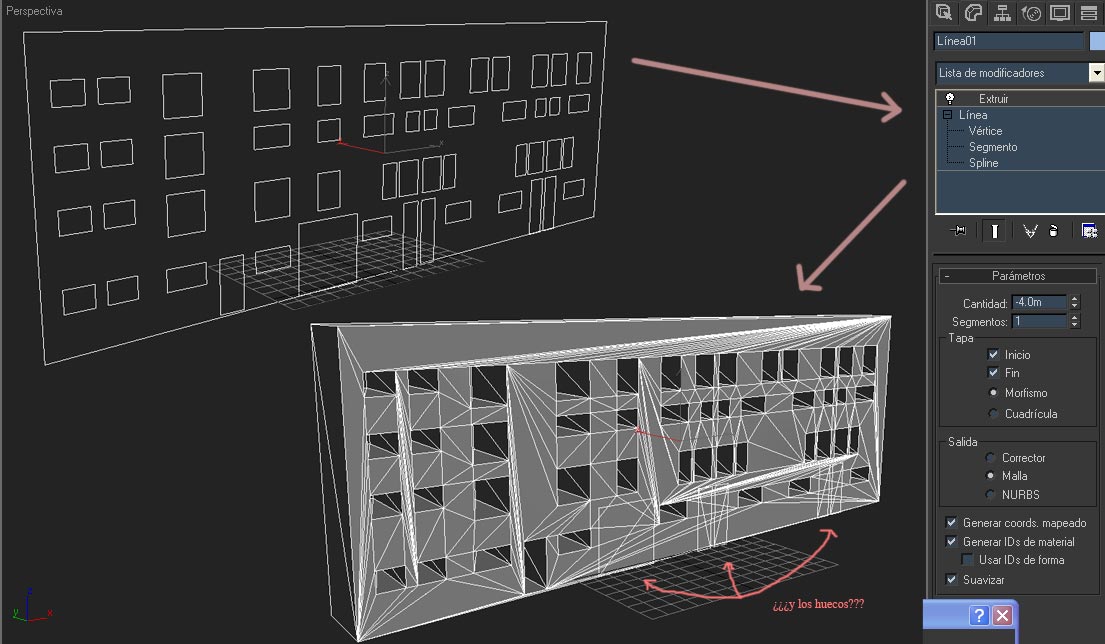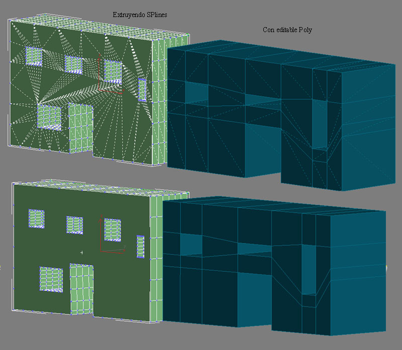 Buenas. Estoy teniendo un par de problemas a la hora de extruir Splines. Veréis: ya sabéis que si creamos una Spline dentro de otra, y extruimos ese objeto, el espacio contenido por la máses negativo. Vamos, que se hace un agujero. He dibujado un par de edificios en 3dsmax de esta manera (mirad la imagen adjunta), y sí que he notado que si después de extruir convierto a malla editable o polieditable, empezaban a aparecer aristas en el objeto. Aristas que no molestan, pero cuando llega la hora de mapear, pueden provocar que el mapa se distorsione en según qué puntos.
