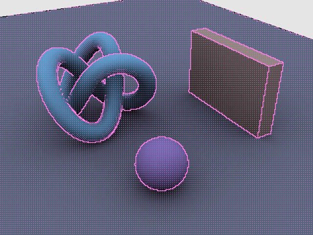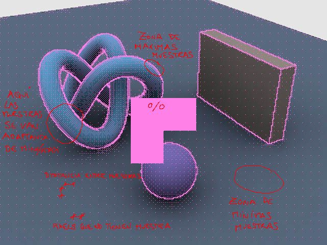 ¿Ves los tres cuadrados rosas en el primer render? Es una zona (render a medías sobre otro render) a 0/0; es decir, todos los píxeles son muestras y por tanto todos son tenidos en consideración para el cálculo, el asunto está en utilizar el mínimo número de muestras posibles (menos cálculo, menos tiempo de render) y, aun así, sacar buenos resultados. Un máximo de 0 significa en los motores: Si la zona lo necesita, coloca una muestra en cada píxel. Un máximo por encima de 0 (1;2; etc). Supone entrar a nivel subpíxel, cosa que muy pocas veces está justificado, ClrThreshold y Normal Threshold son números que especifican la posibilidad de añadir más muestras según la diferencia de color de dos muestras cercanas o el ángulo que formen. Según el render, a veces es útil utilizar uno u otro criterio para añadir muestras en las zonas difíciles.