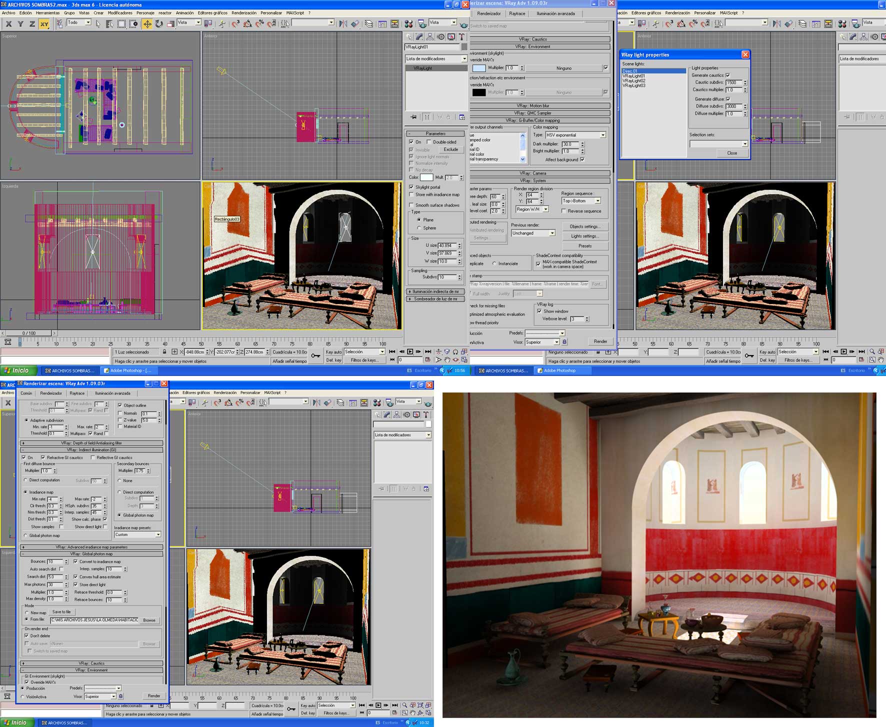 Hola de nuevo compañeros. Heme aquí con una nueva duda sobre este gracíl mundo de los Photones. Me hallo en los prolegómenos de una escena. Una habitación con exedra y en principio totalmente cerrada, tiene unos ventanales en un extremo en los que he puesto 3 luces Vray.