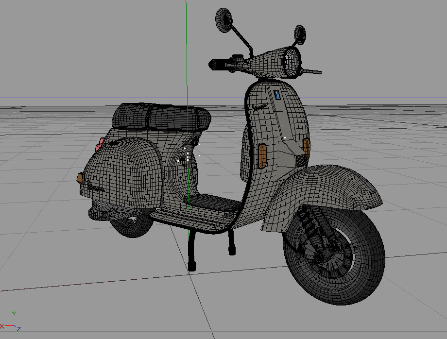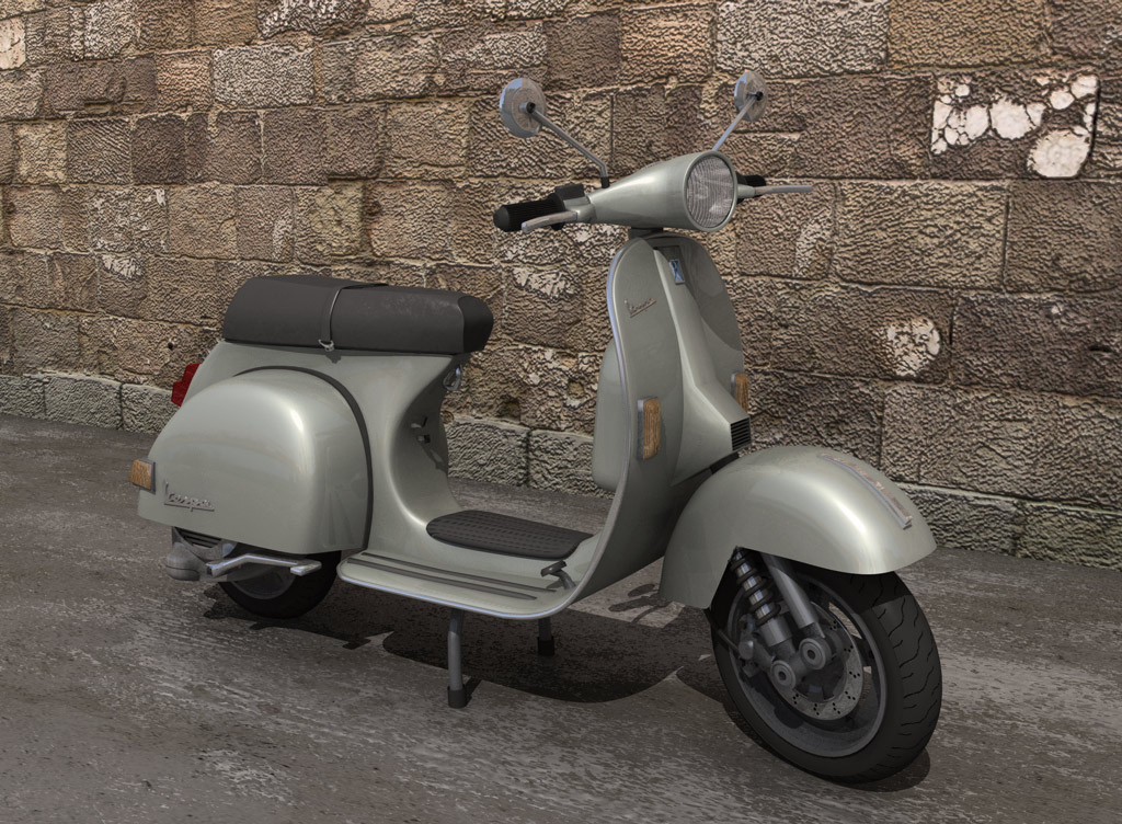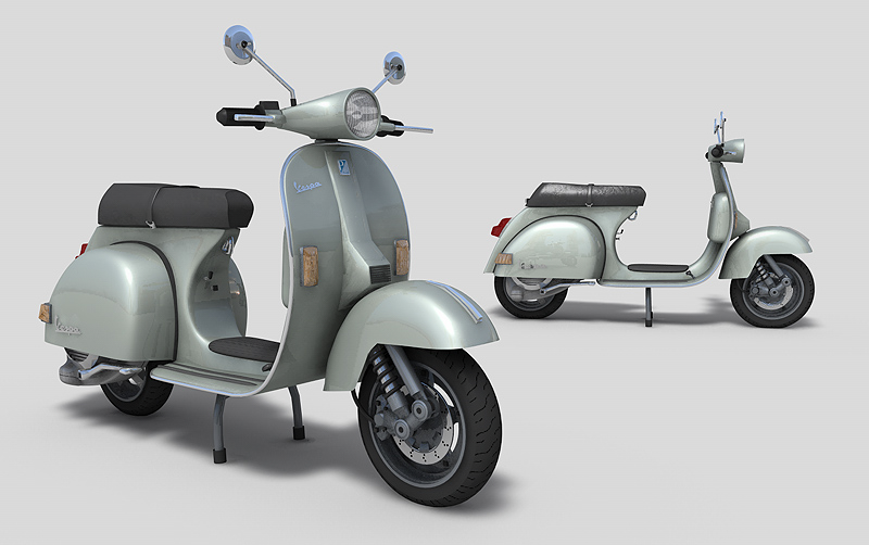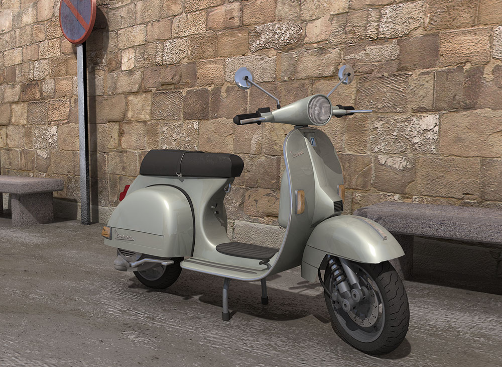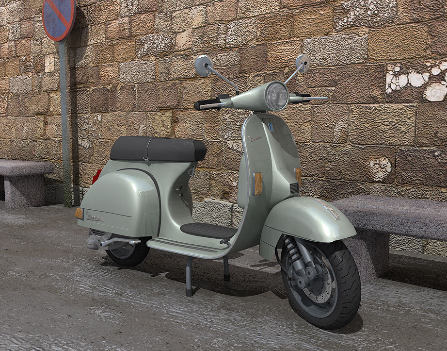 La excesiva limpieza de los materiales del modelo de la Vespa le da un aire plasticoso y frío. Son extrañas sombras tan duras y negras con una luz tan difusa y gris.