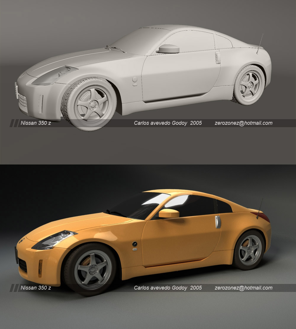 Buenas, esta es mi versión en 3d del Nissan 350 Z. Aun le faltan muchas cosas como el interior y el motor, lo hice como reto (en 4 días) y más adelante espero usarlo para una animación. Un saludo a todos.