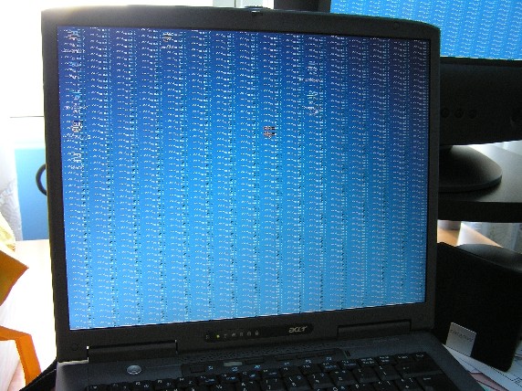 Bueno, tenía que pasar, sería raro. El caso es que un portátil que tengo desde hace casi 3 años y que utilizo normalmente para enseñar trabajos a clientes y programar (es decir, nada de darle caña al micro ni a la gráfica), comenzó a mostrar ayer algunos artefactos en pantalla, sobre algunos botones en el sistema operativo. Creyendo que era error de dibujado de Windows, reinicié, con la desgradable sorpresa de que ocurría también fuera de Windows, tanto en modo texto como en modo gráfico.