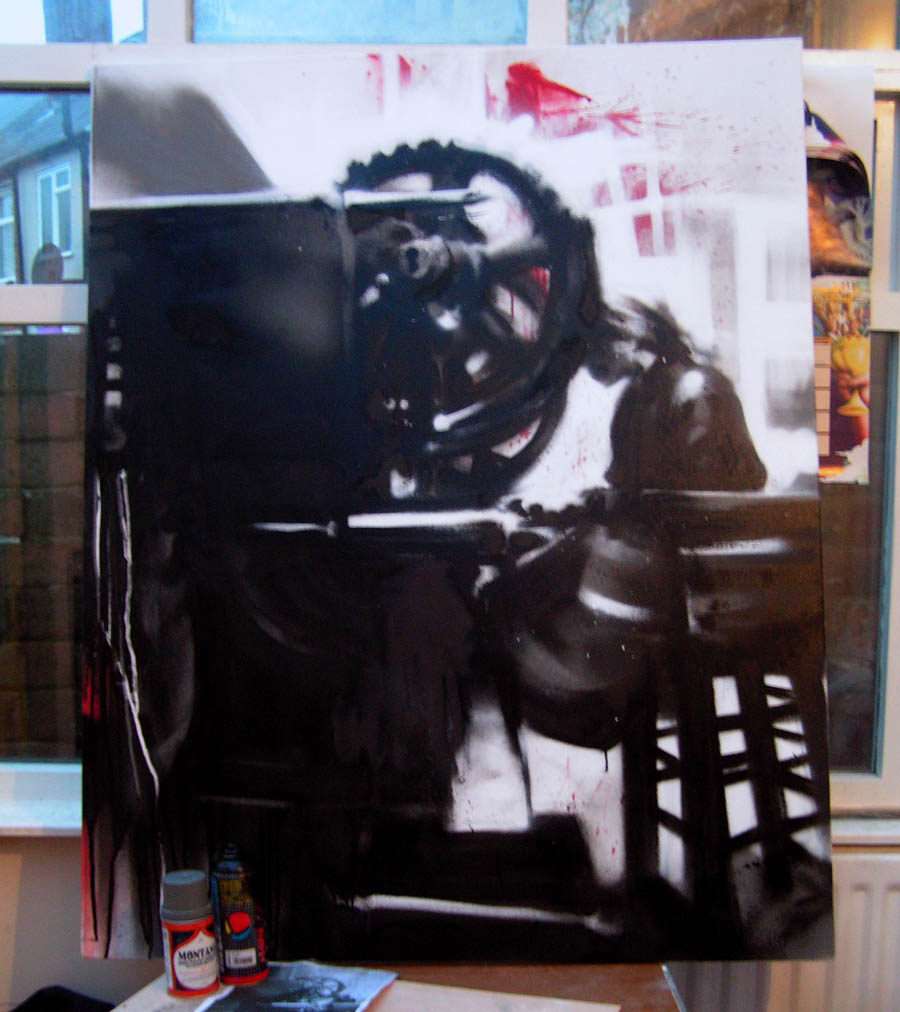 Bueno, no sé si pega mucho esto aquí. Pero me gusta cómo está quedando así que, ahí va. Esta pintado a partir de una fotografía, con aerosol. Saludos.
