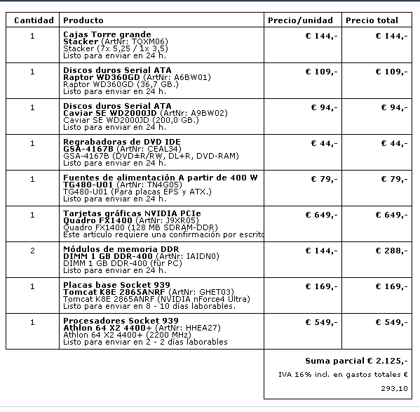 Por lo demás, me parece perfecto por cierto, si puedes esperar un par de semanas, en alternate Alemania ya han aplicado las bajadas de precio de los x2 anunciadas por AMD hace unos días (el 4400+ ha sido rebajado a 489 EUR), con lo que en aternate España deberían aplicarlas en breve.