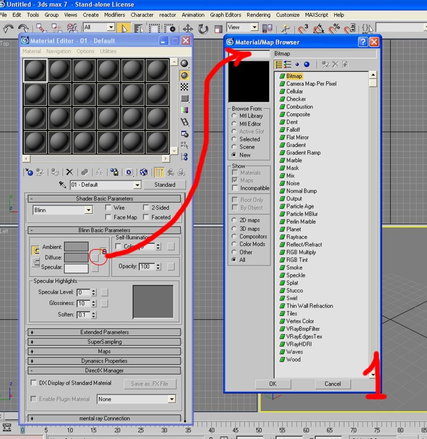 Hola, me permito opinar. En 3dsMax 7 en adelante, solo tienes que, arrastrar la textura desde el explorador de Windows hacia el objeto en 3dsMax que quieres texturizar? Y está listo. Saludos.