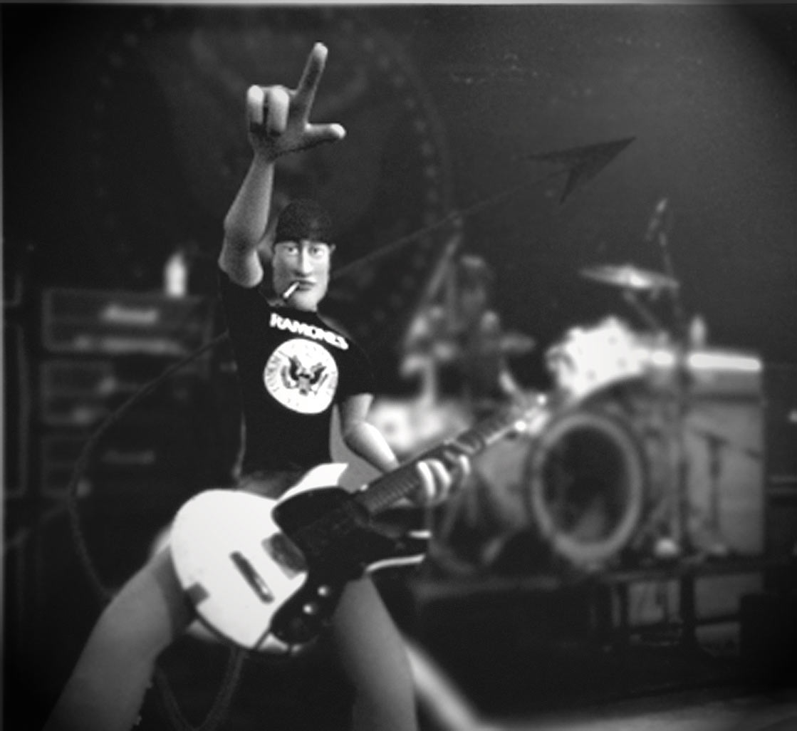 Bueno, a mi parecer no pega ni con cola el fondo que has puesto con el personaje, al mismo tiempo se ve un borde negro alrededor de todo el personaje que queda feo, intenta suavizar esa integración, coincido en lo de que los dedos quedan raros tanto que sean 4 como que no tengan uñas, en general el personaje es tirando a realista y las manos son demasiado cartoon, muy tipo Mickey mouse, amos, que no pega, el tipo carece de expresión, tiene la cara como congelada, la postura indica que esta como disfrutando del momento, y la cara no la acompaña, yo intentaría abrirle la boca como gritando, y fruncirle el ce¿o o algo, pero que tenga alguna expresión facial, la postura que le has puesto no está mal, se puede mejorar mucho, pero de momento te diría que lo pongas más recto ya que pierde el equilobrio, se cae hacia atrás, o esa es la sensación que d? Y el cable que sale de la guitarra es gordo como el solo, parece un tubo más que un cable.