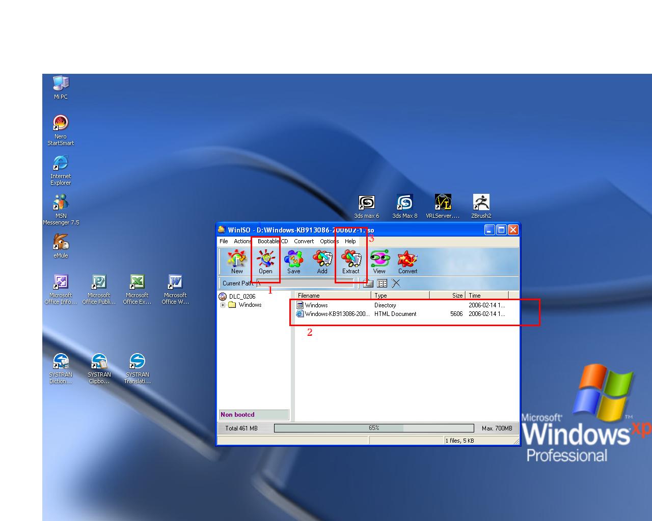 Te adjunto una imagen del Winiso con el ISO de Windows service pack 2 abierto.