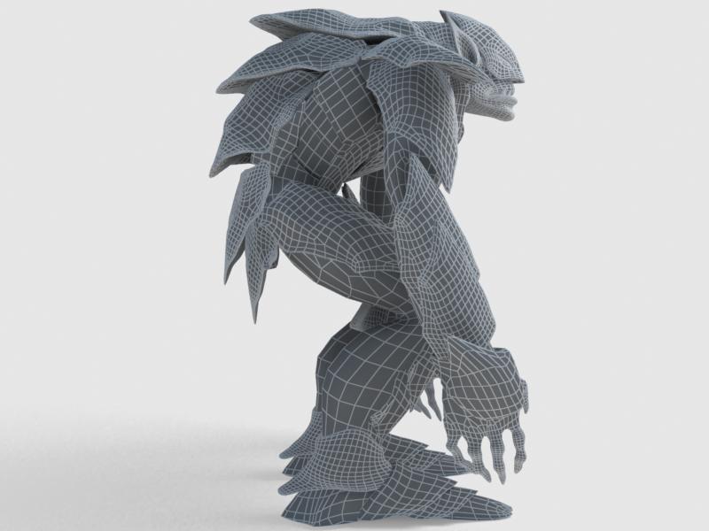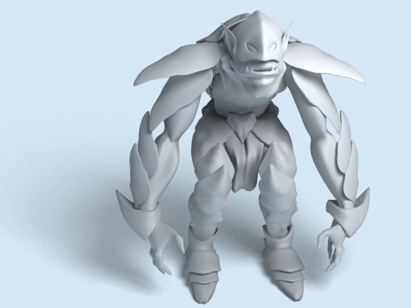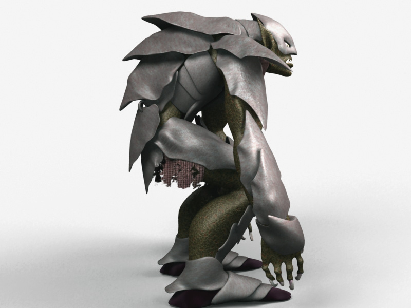 Pues está muy chulo, tiene que ser un calvario para la espalda estar en esa postura todo el día, pero está bien. Me gustan mucho esas manos con garras y la pinta de la armadura en plan armadillo/libélula/bicho, aunque los brazos no tienen musculatura definida (a lo Venom de por aquí abajo, vaya), dicen que luego eso da problemas con el Rig y no queda verosímil al mover el brazo (me estoy yendo por los cerros de Úbeda, yo tampoco defino musculaturas), o es de complexión menos fuerte que los orcos típicos o todavía no está hecho, o con la armadura se va a disimular (cualquiera sabe). Por otra parte, veo las piezas colgantes de la armadura un poco planas, aunque las texturas hacen milagros.