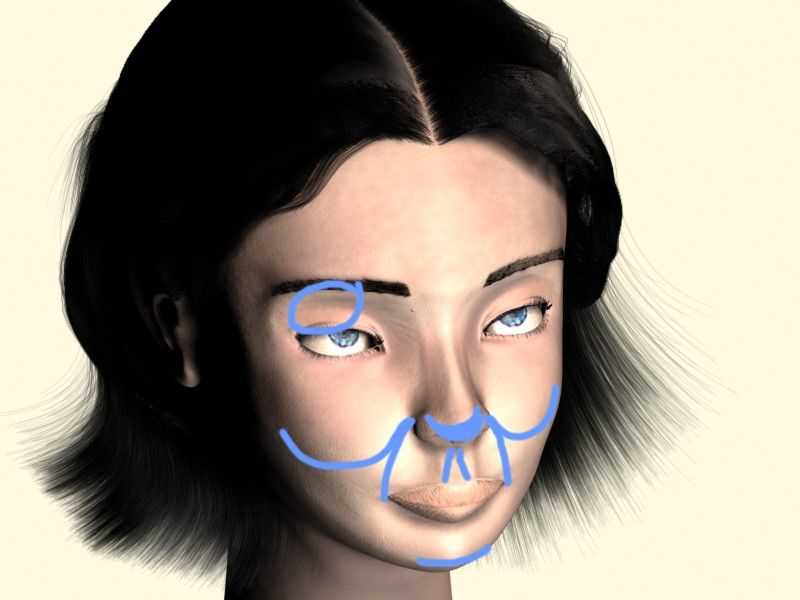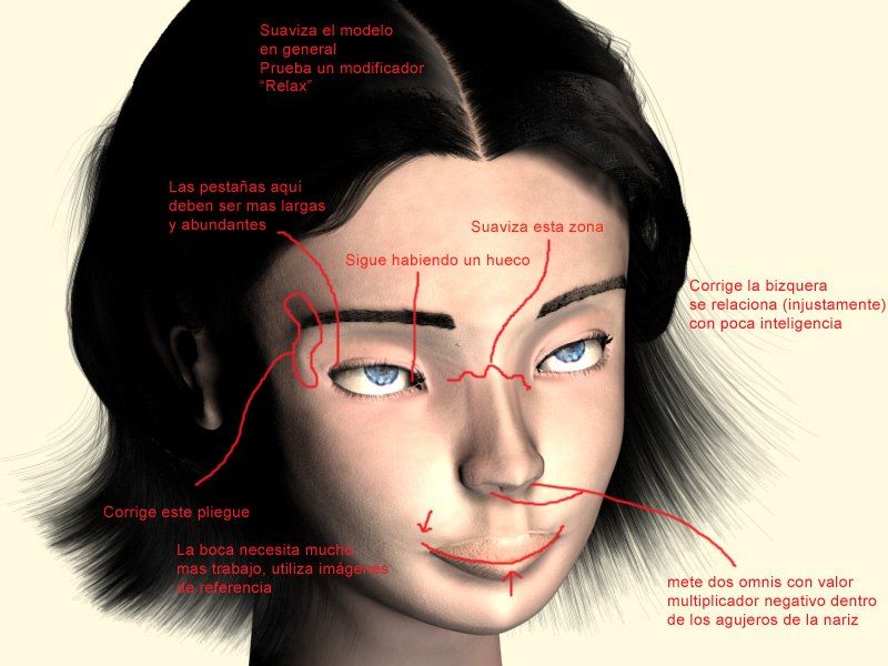 Buenas. Vas por muy buen camino. Pero yo seguiría mejorándolo. Las primeras apreciaciones ya las han comentado. El tabique nasal tienes que mejorarlo, otro tanto los labios, te adjunto una imagen y te comento: a) entre las cejas y los párpados, la superficie está muy plana. No sé cómo explicarlo, pero si te fijas en otros modelos o incluso en la cara de alguien, b) la nariz tiene una punta muy exagerada. Debería ser más redondeada, c)lo mismo la barbilla, d) las mejillas deberían estar más marcadas, o con más forma, e) debes marcar las líneas que van desde los extremos laterales de la nariz hasta los de la boca, f) la forma que se crea entre la nariz y labio superior (en el centro), debe ser más estrecha, quizás con diferentes vistas del modelo y sin texturas podemos indicarte mejor como mejorar la anatomía. Incluso con imágenes de la malla. La luz que tienes tampoco ayuda, pero va más que bien.