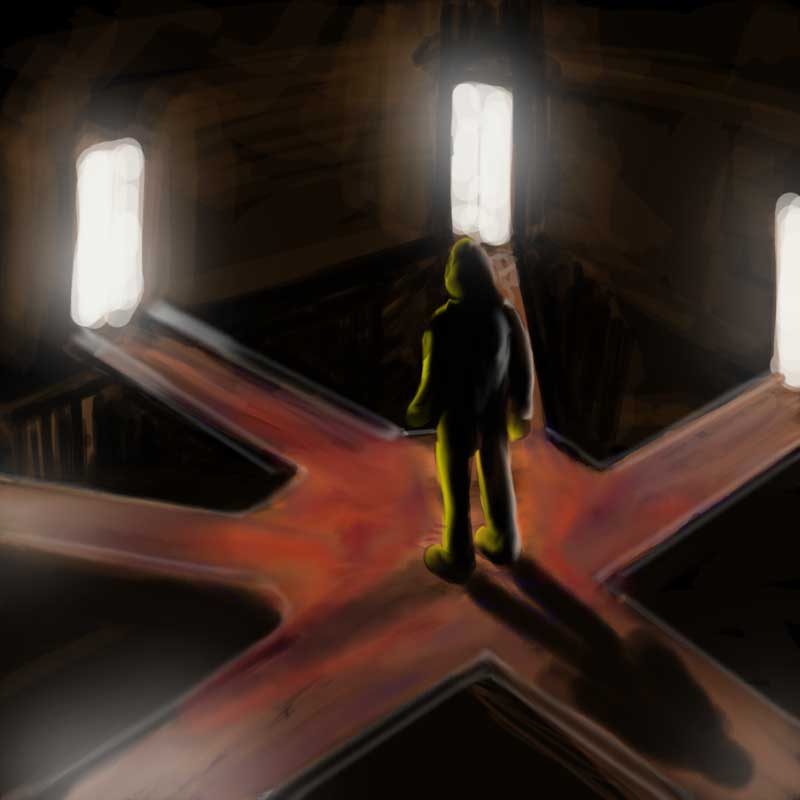La idea del tipo ante las puertas me encanta, me ha recordado a Cube. Coincido en la incoherencia de la sombra, debería haber muchas más sombras. Un saludo.