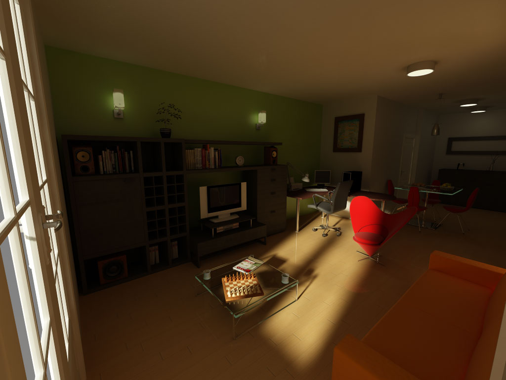 Por cierto, me ha encantado el tono azul ¨esmeralda¨ que se ve en el borde de la mesa de cristal del fondo. Un detalle muy realista a mi forma de ver.