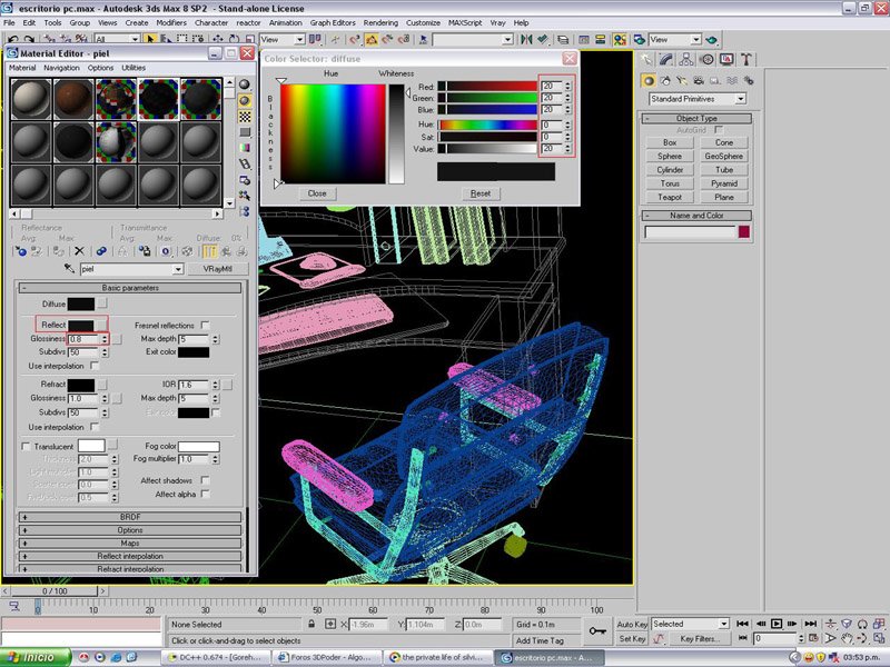 Está bastante bien y una típica imagen mona de escritorio. Pero, nunca comprendo porque la gente que modela un monitor, se le olvida algo tan obvio (a fin de cuentas, seguro que se ha pasado horas frente este). Como que un monitor emite luz e ilumina.