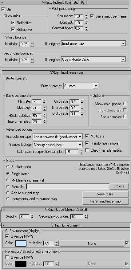 Estoy iluminando con Irradiance Map y Quasi-Montecarlo, lo que primero se me ocurrió a mi es subir los rebotes en Quasi-Monte Carlo, pero no note mucha diferencia, también subí los multiplicadores de los rebotes, pero la escena se quema y el interior no cambia en nada, publico los parámetros a ver qué dicen.