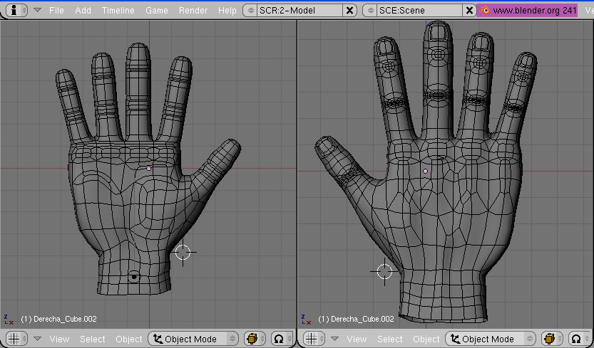 Gracias por los comentarios, aquí dejo los wires del antes y el después, coincido contigo Elgordo, se ve muy rígida en las articulaciones, pero como la hice extendida para pasarla a ZBrush a la hora de querer posarla tuve que hacer la postura sección por sección, con tantos vértices no más no me quedaba un riggeo aceptable, a propósito, la base la hice siguiendo el fabuloso tutorial de Antropus, está en portugués, pero es fácilmente entendible con las imágenes, http://www.Antropus.com/tutorial_hand1.html.