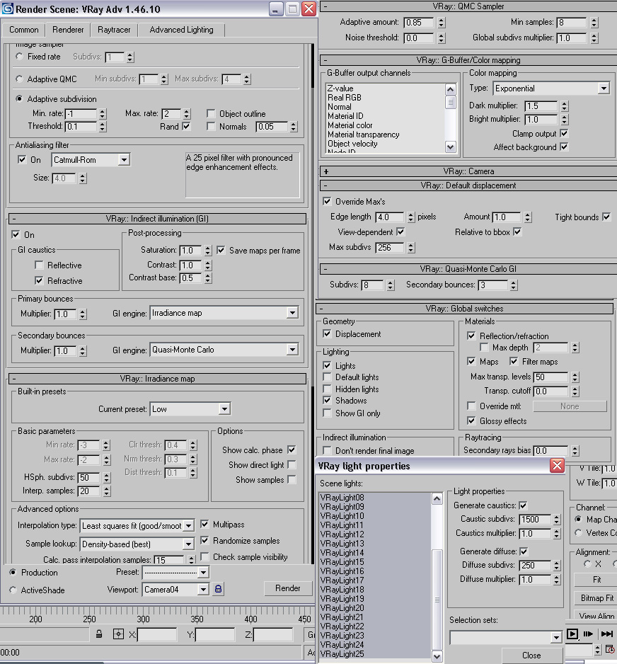 Lo que yo pensaba: para interiores estas usando irradiancia + Quasi Montecarlo. Revisa la ayuda de Vray, porque hay métodos más rápidos y eficaces para calcular interiores (fotones, Lightcache). Dedícale un tiempo a estudiar estas cosas, porque facilitaran tu labor de representación.
