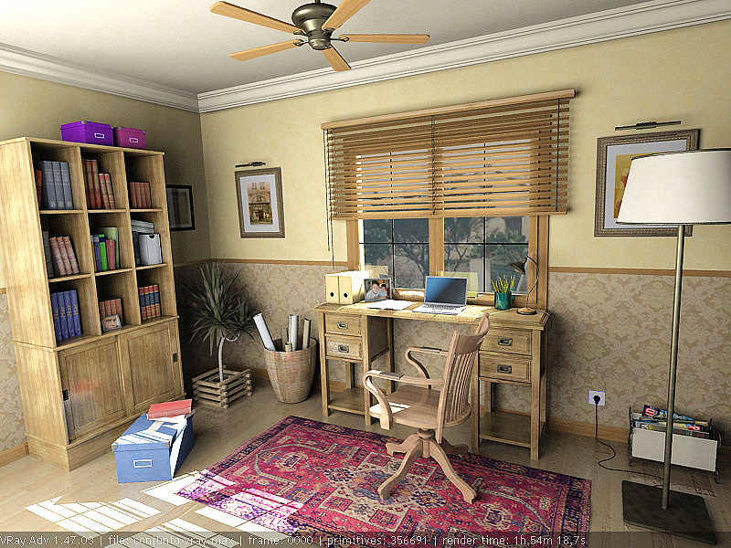 La imagen se ve muy bien por poner alguna pega, la sombra de la ventana que cae en el suelo debería ser un poco difusa y si el sol esta a la derecha la iluminación que proviene desde la izquierda es excesiva o mejor dicho irreal.