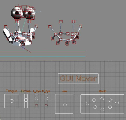 Now, once a character is in motion, it can be very dificult todo animate its face by clicking on each of the points and rotating/dragging them locally, so, my next step was todo set up a very simple GUI that would allow me todo control each área of the face easily and accurately. i did this by wiring the transforms of each point that i neded todo be animatible todo a shape whose referenced position would be used todo control the chosen transform (rotation or position) of that point.