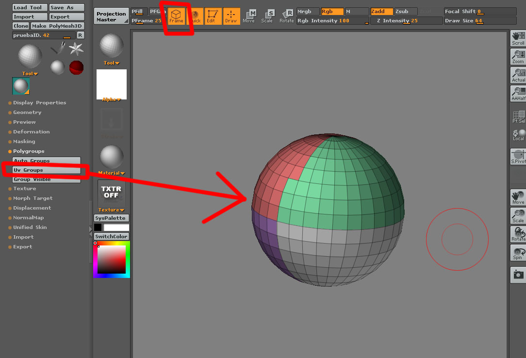 Creo que se haría de la misma manera que cuando ocultas una sección de la malla generada con ZBrush de un color determinado (activando el modo frame). Si pulsas Control + shift cuando haces click sobre esa sección, se oculta todo lo demás. Para recuperar toda la malla, la misma combinación, pero sobre una zona vacía del visor. Creo recordar que cuando dividías un objeto en id y luego exportabas a ZBrush, te las mostraba como cada una de un color distinto.