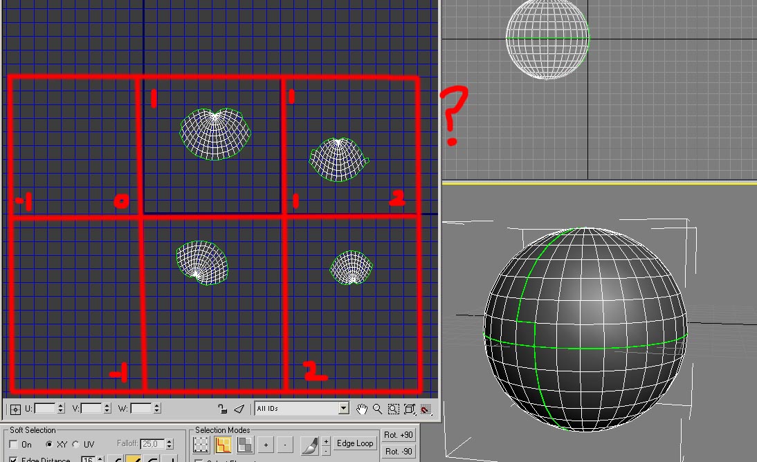 Empecemos haciendo una esfera (1), a dicha esfera le pondremos solamente un modificador de Unwrap (2) para sacar las UVS (recomiendo que se empollen el Unwrap ya que, con los Pelt y la cantidad de herramientas que tiene, es todo un lujo). Una vez hayamos desplegado la malla (esta es automática en este caso) se comprueba que no haya ningún polígono solapado, ¿cómo? Con el render UVS que trae el editor del Unwrap de 3ds Max eligan las mismas opciones y pongan solid que es para este fin (3).