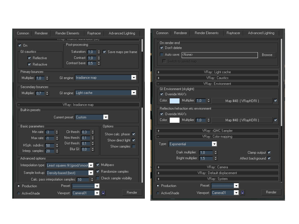 Bueno subí algunas capturas con las configuraciones usadas, solo falta añadir que use el Vray frame buffer para ajustar la curva de corrección del color, y en Adobe Photoshop le aplique un autocontrast, si se me olvida algo preguntenme no más.