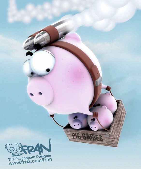 Hola gente, aquí os dejo una imagen que me he trabajado en estas vacaciones. Es un cerdo que va volando gracias a los cohetes que lleva sujetos a su lomo y que transporta a sus pequeñines hacia un destino mejor donde no terminen siendo jamones y salchichones. En fin, que espero que os mole.