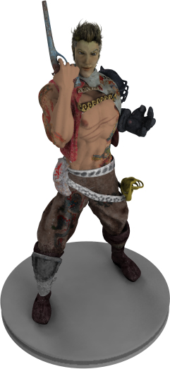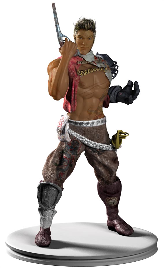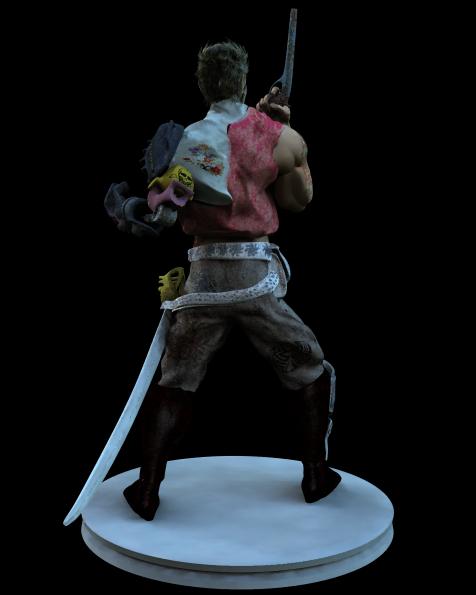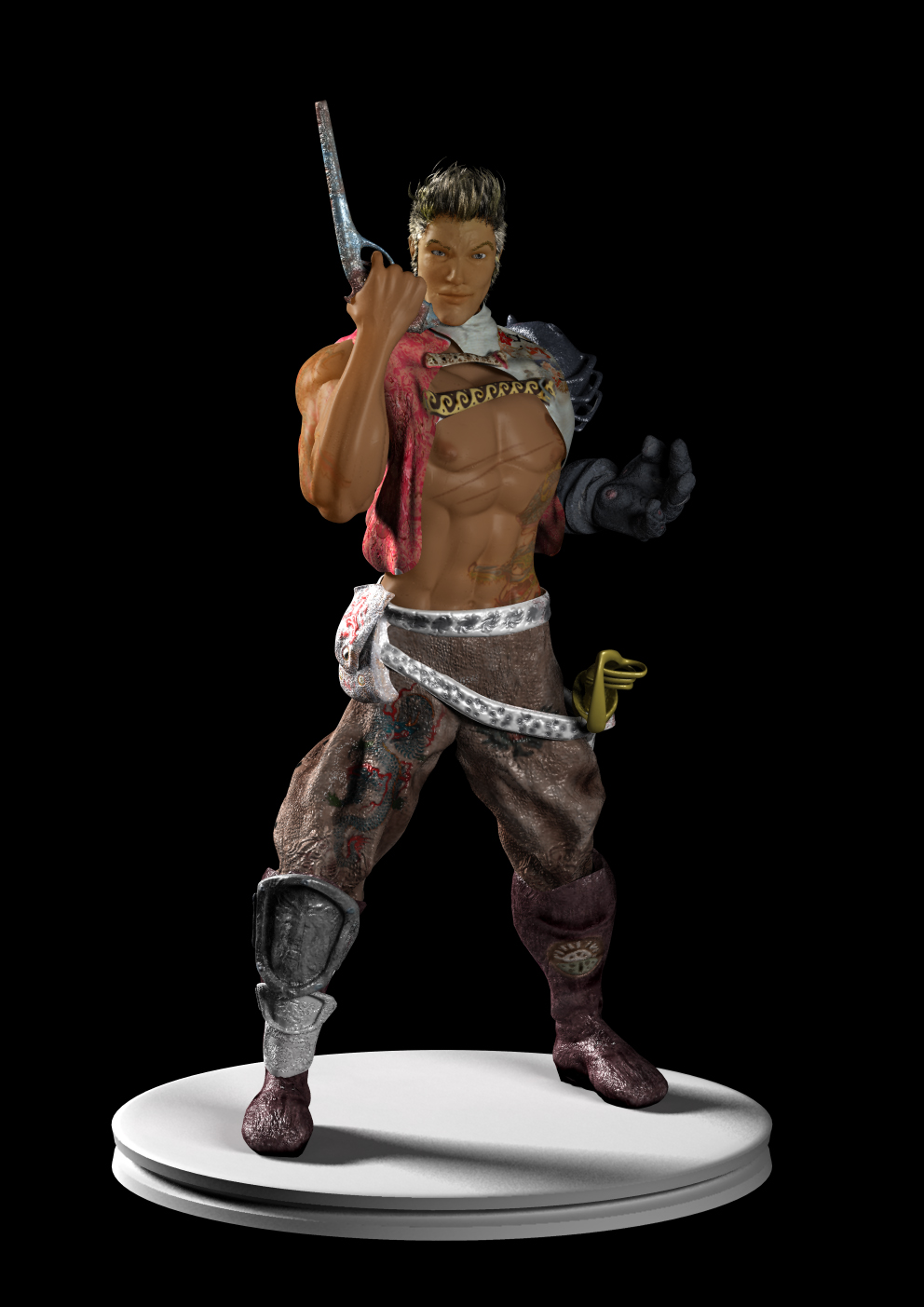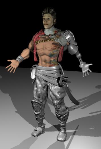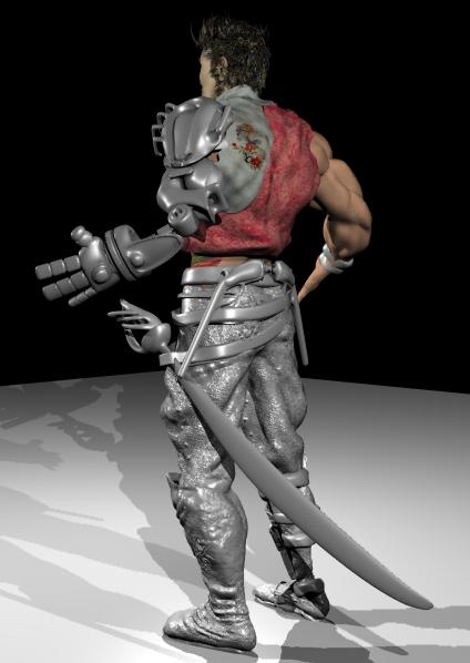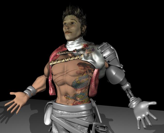 Creo que te haría falta aunar un poco más el concepto, sobre todo en lo que corresponde a lo que no es el cuerpo y rostro del modelo. Si me permites decirlo, las texturas que has elegido son horribles, creo que guiado por un excesivo barroquismo. Prueba con materiales más simples, por ejemplo, en el pantalón. Les sobra el brillo. Los cinturones parecen hechos deprisa y corriendo, y el brazo mecánico es poco mecánico.